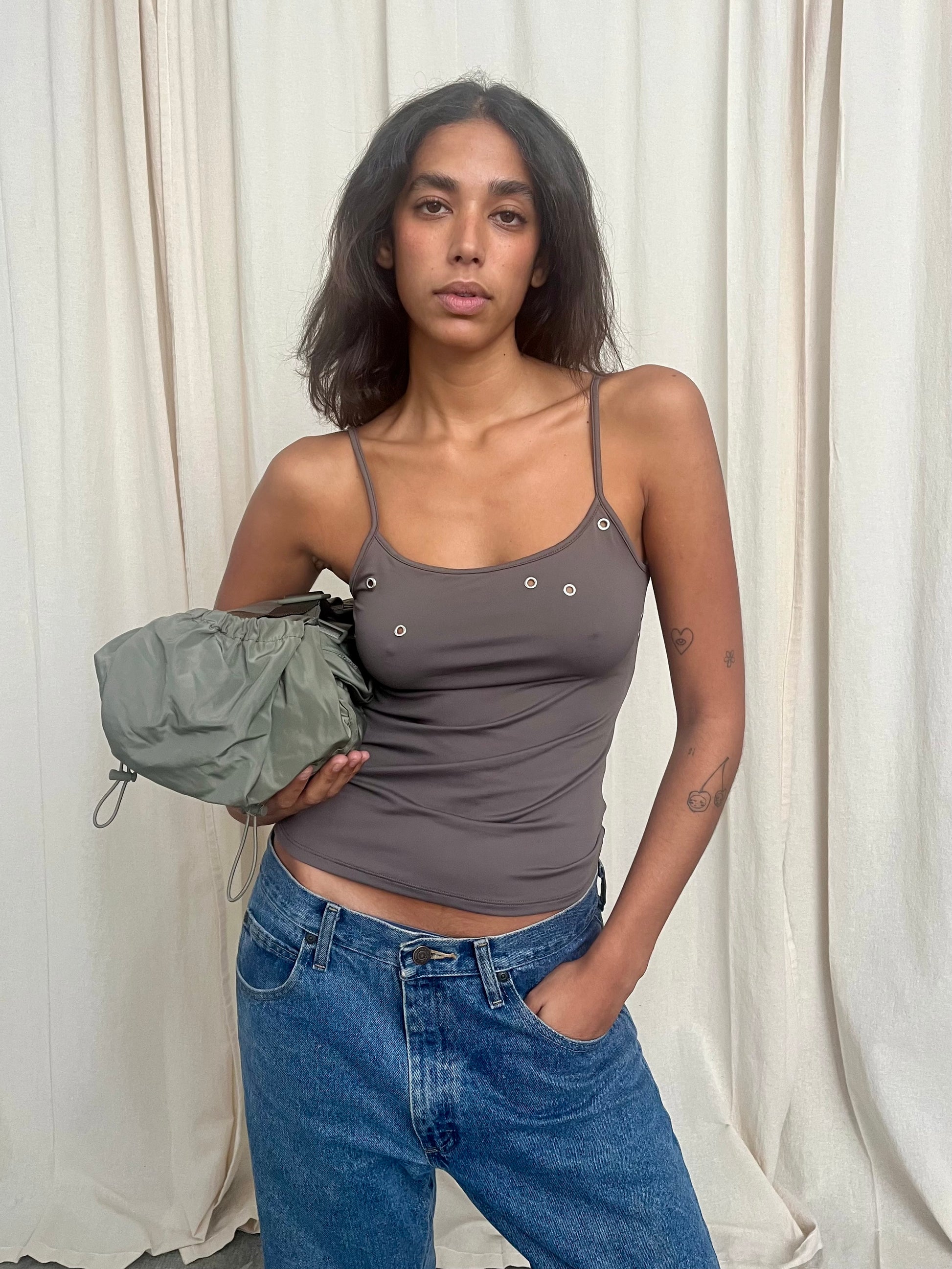 Fitted tank top with metal eyelets.