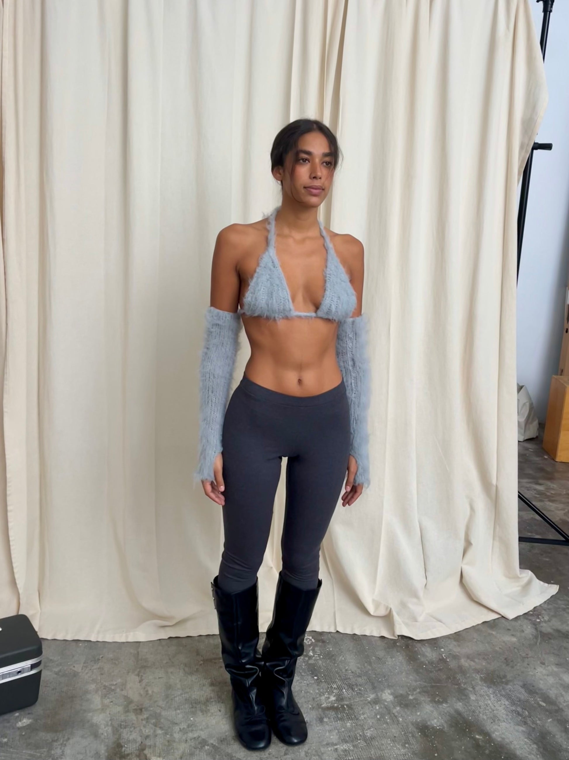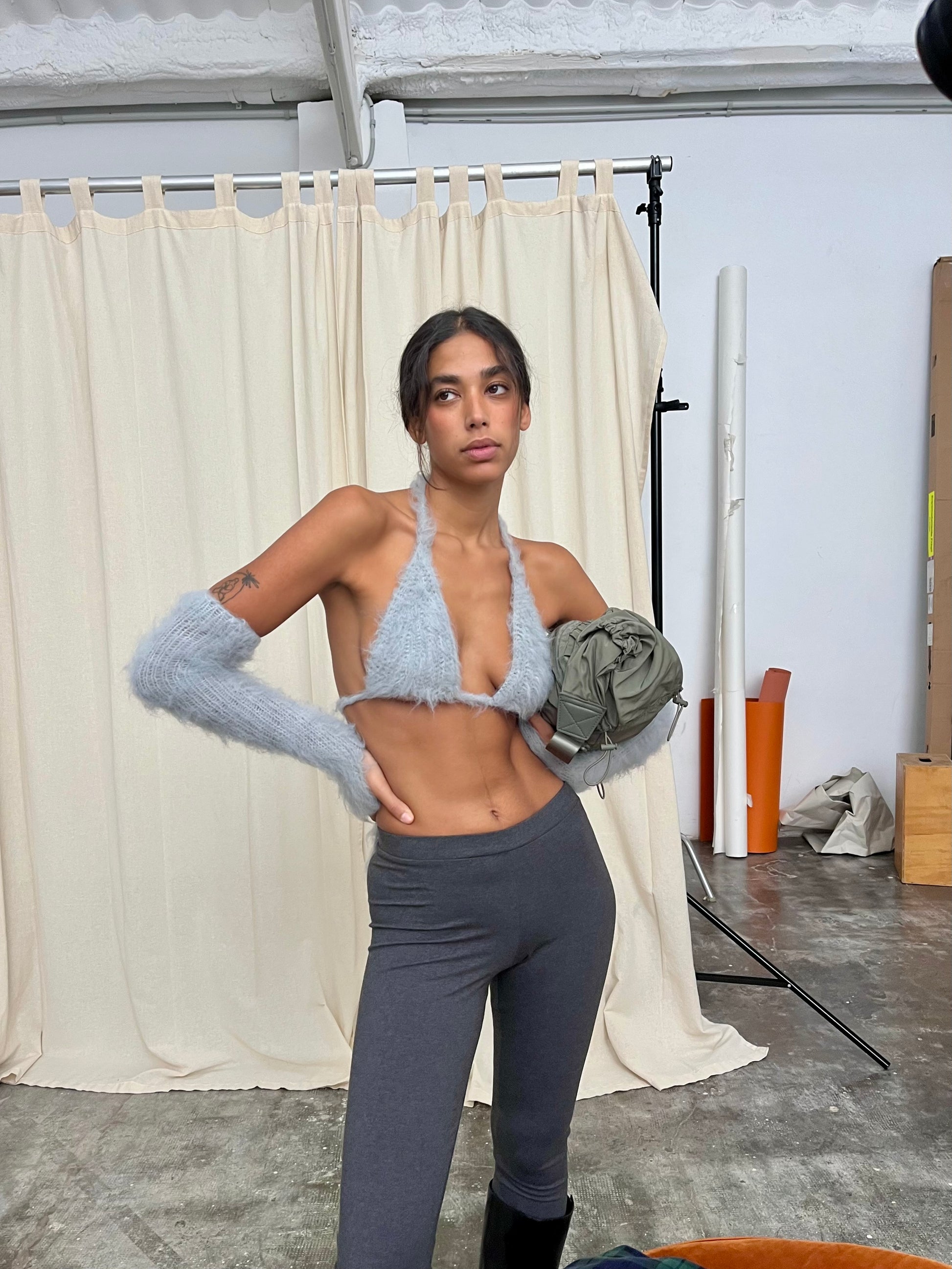 Long gloves knitted with wool from synthetic and vegetable fibers with open fingers.