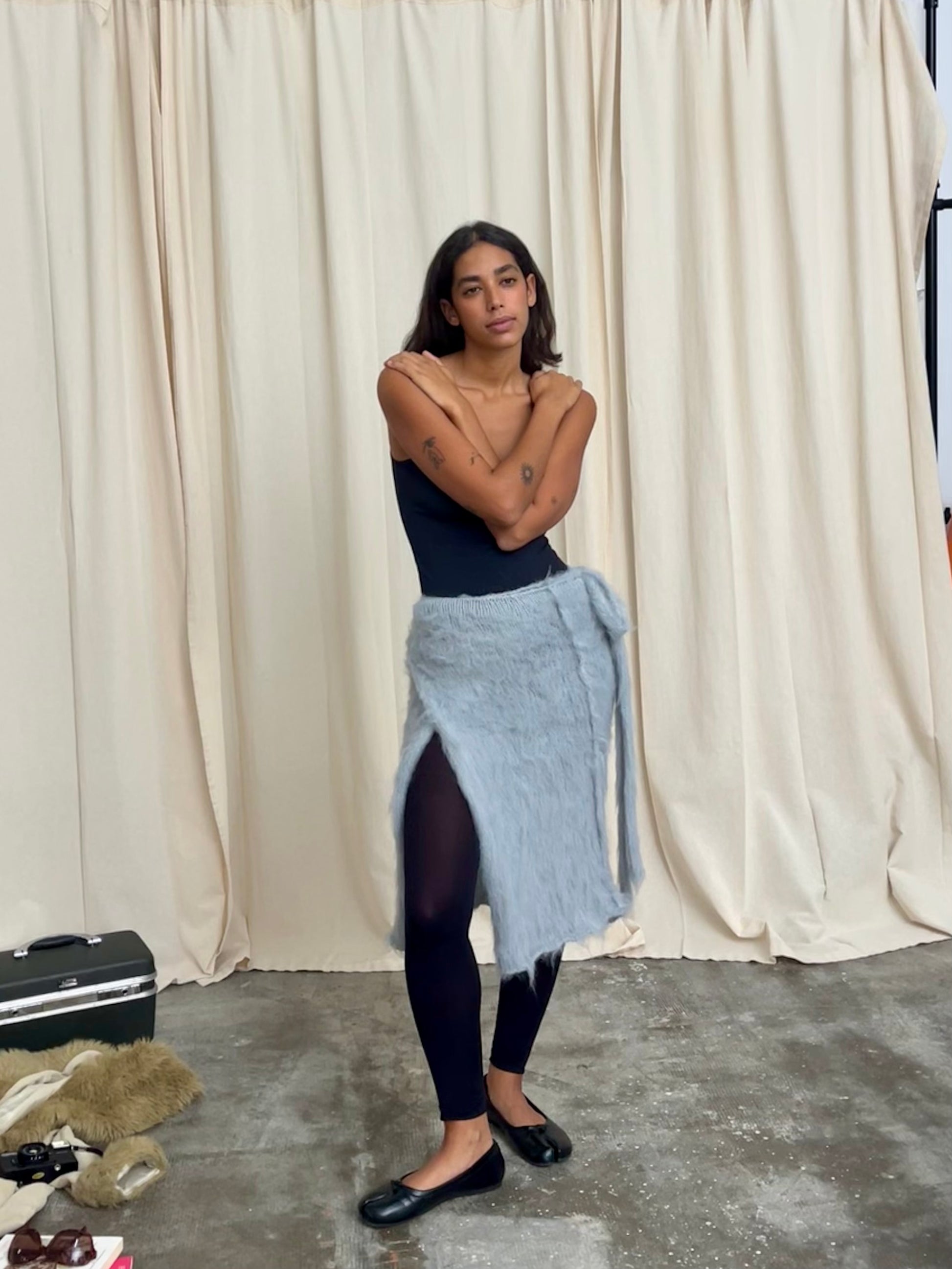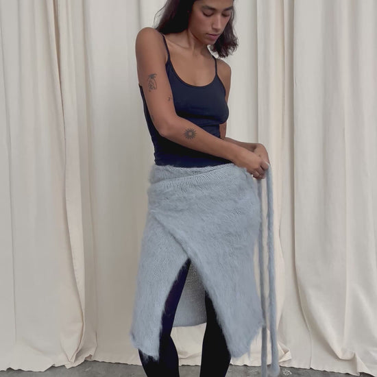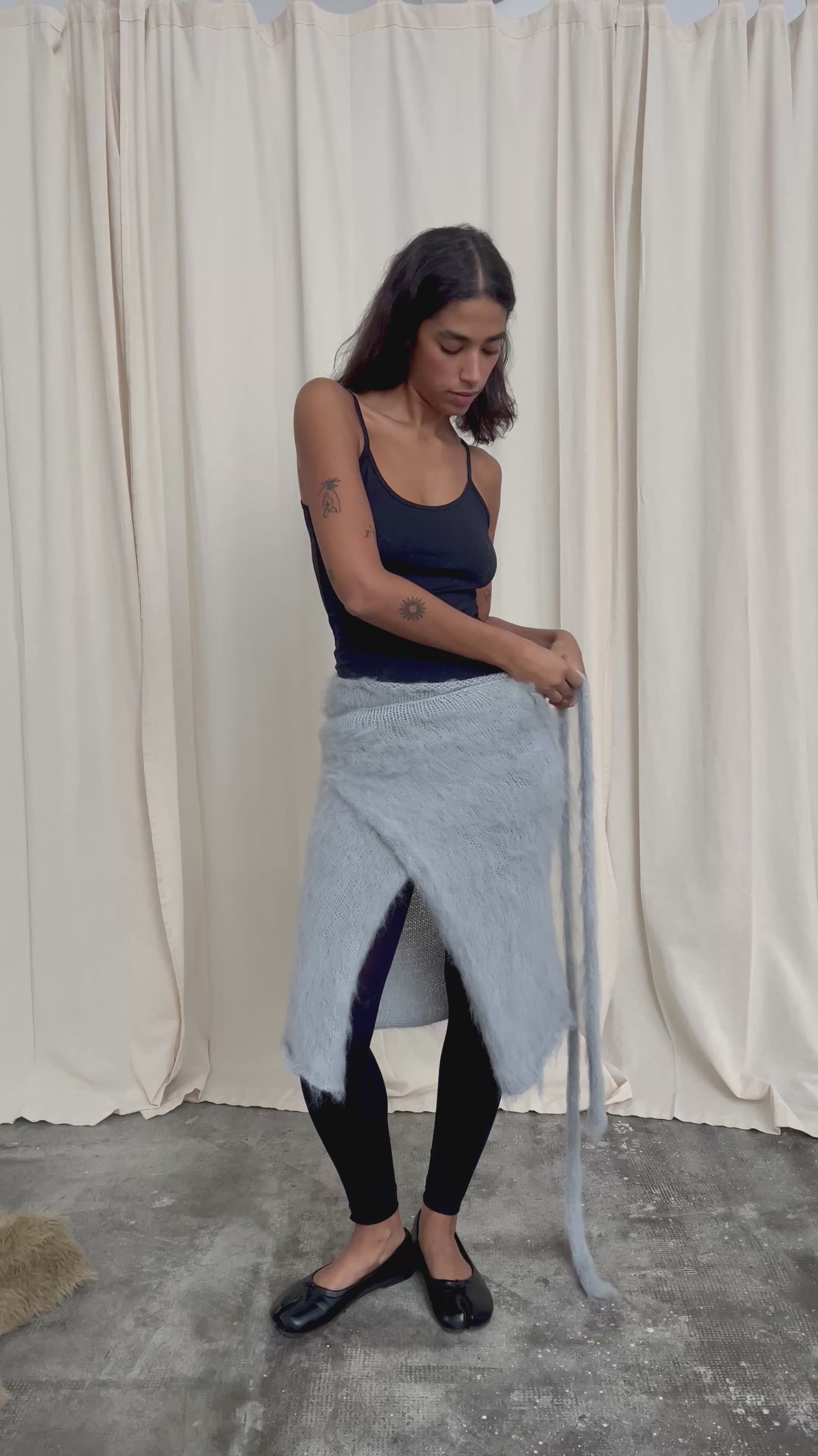 Multi-position skirt. The skirt can also be worn as a short cape. Made with a blend of synthetic and plant-based wool fibers, specially formulated for sensitive skin.